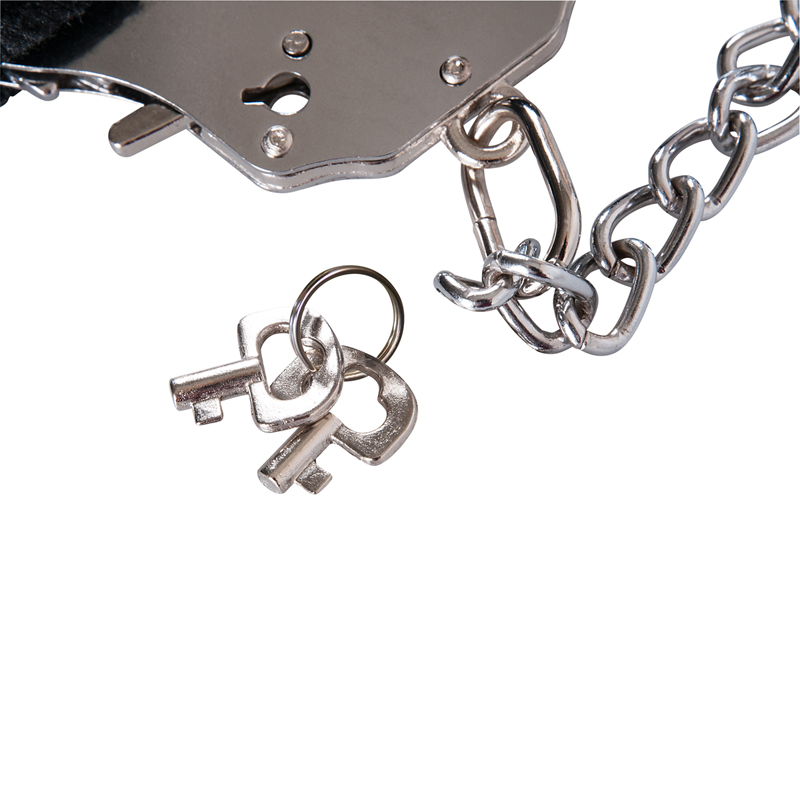 Schwere Handschellen mit langer Verbindungskette und schwarzen, abnehmbaren Plüschbezügen.