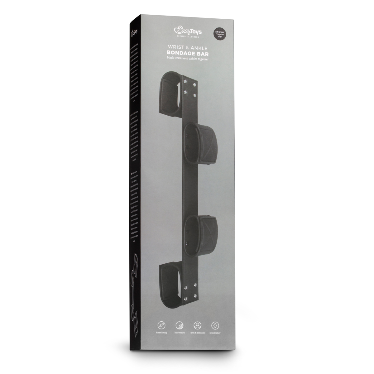 Mit dieser Bondage-Stange können Sie Ihre/n Devote/n sicher gefesselt lassen solange sie das wünschen. Die Hände Ihrer/Ihres Devoten werden an seine oder ihre Knöchel gefesselt, wodurch ein Entkommen unmöglich gemacht wird. Die Manschetten sind aus starkem Kunstleder und für eine komfortable Anwendung mit Schaumstoff gefüttert. Sie sind aufgrund der Klettverschlüsse leicht verstellbar. Die Bondagestange hat ein ein elegantes Design und ist aus haltbaren Materialien, so dass Sie sie noch lange genießen können.