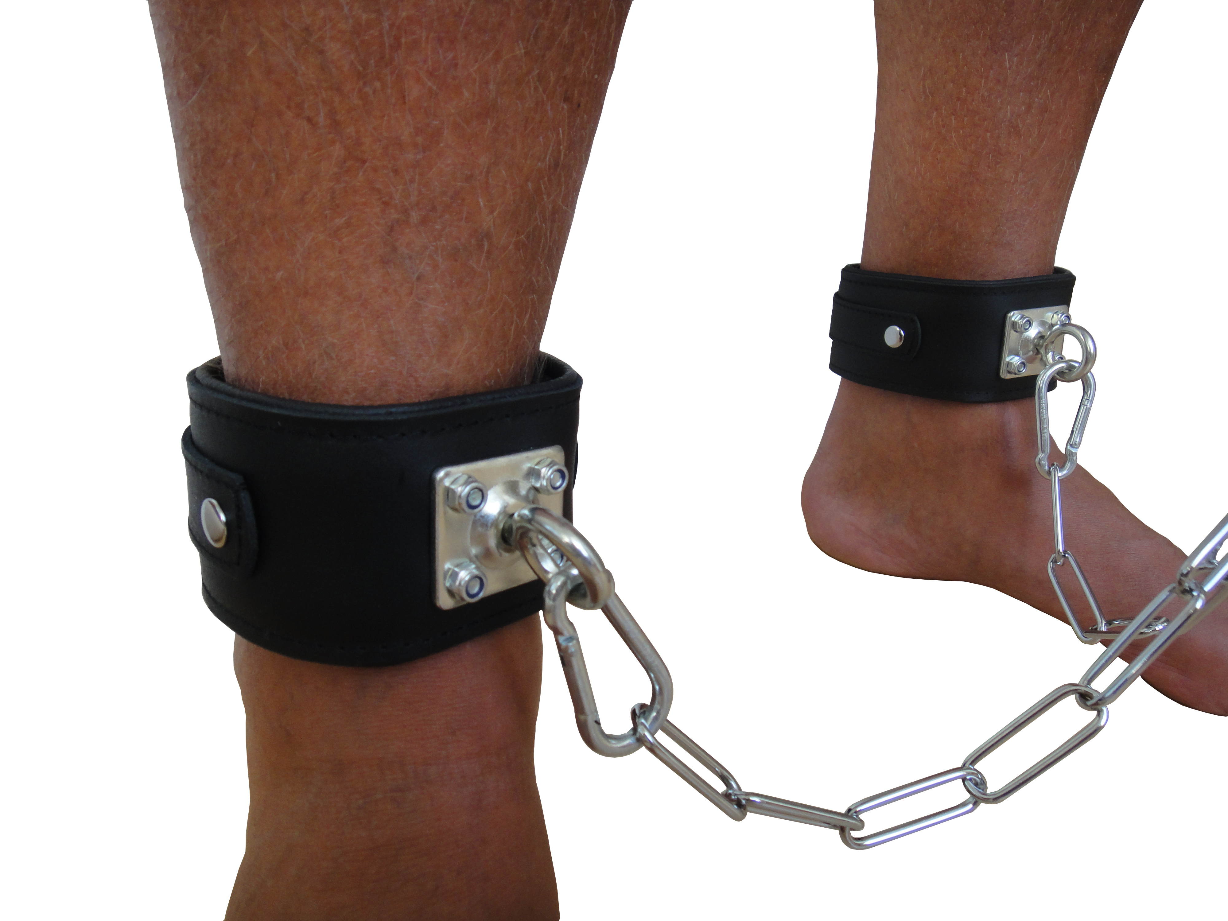 Produktinformationen "Leder Fesselset mit drehbaren Edelstahlringen Schwarz mit dicker Kette und Karabinern"