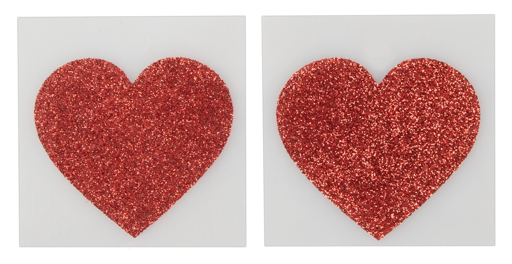 Glitzernde rote Nippel-Herzen zum Aufkleben. Auf der Rückseite mit Haftstreifen.